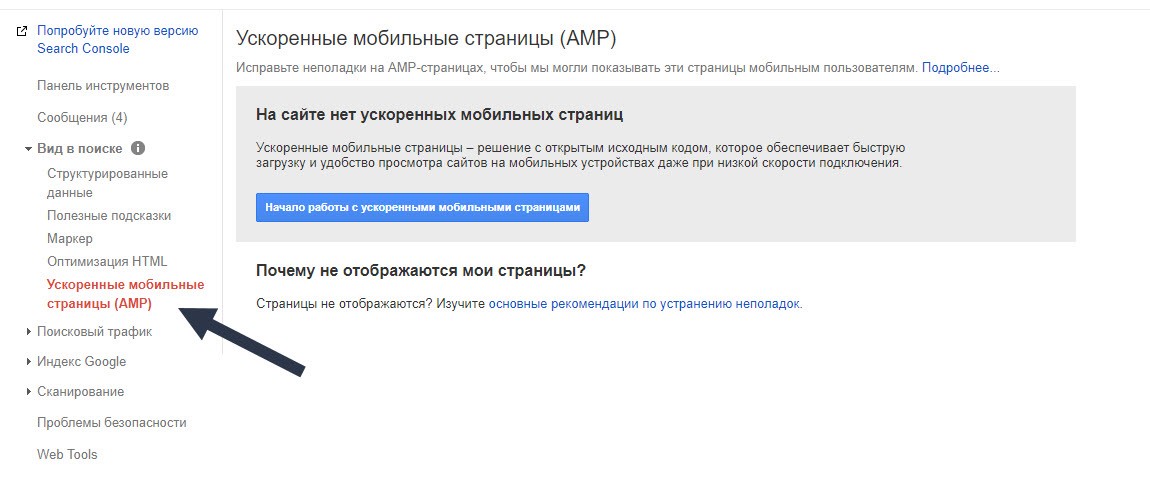 Страницы AMP, найденные Google, указаны в Search Console, в отчете «Ускоренные мобильные страницы». Чтобы просмотреть отчет, выберите «Вид в поиске», далее − «Ускоренные мобильные страницы». Если страницы AMP созданы только что, увидеть их в отчетах можно будет через несколько дней.