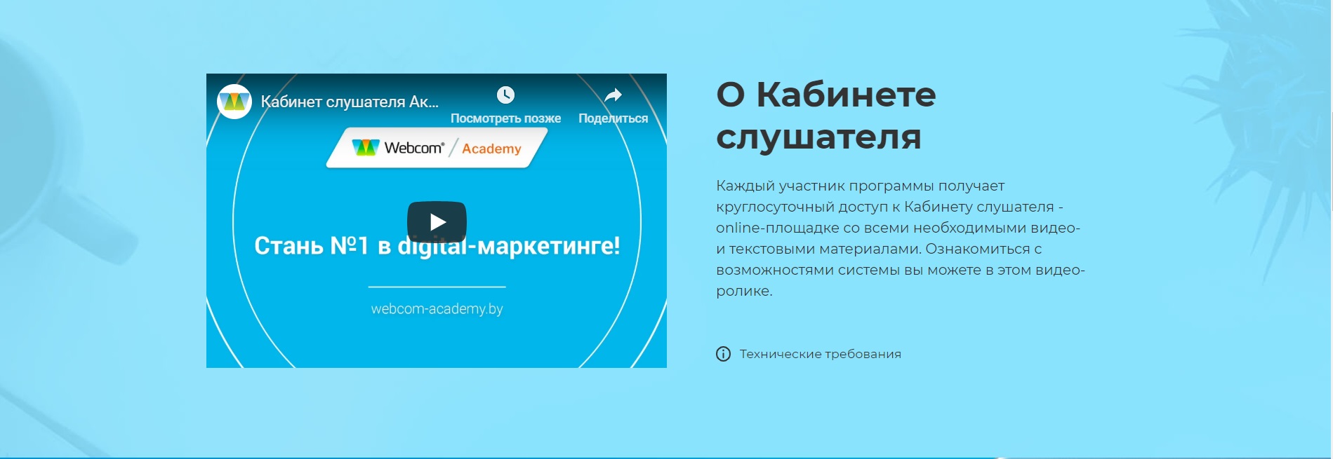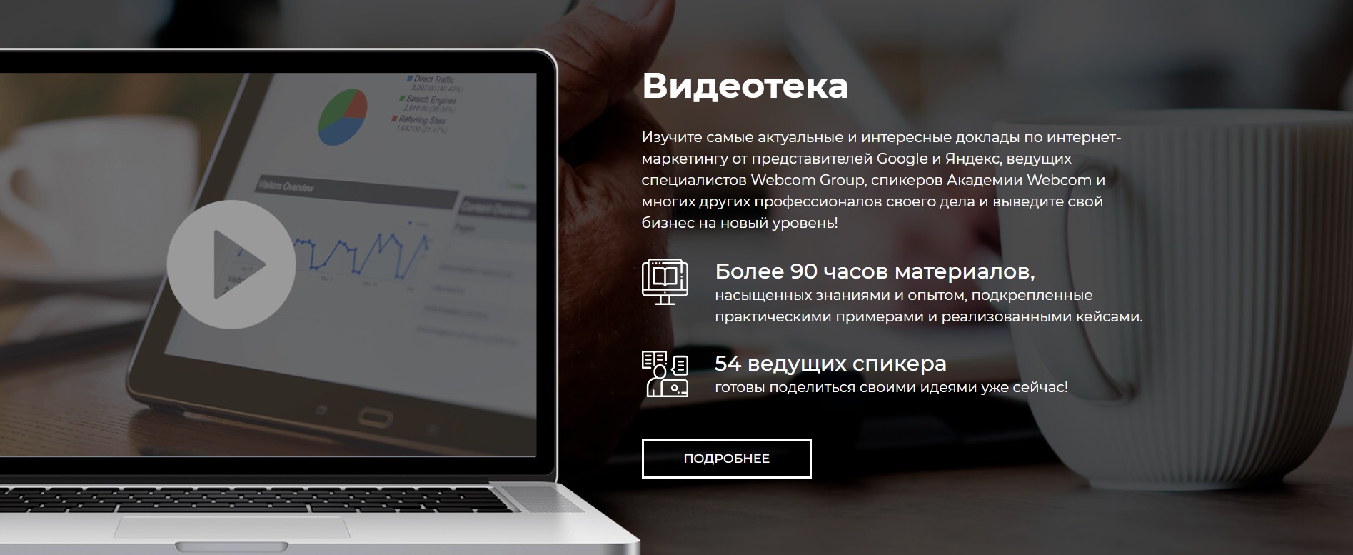 4. Видеотека Webcom Academy. В Кабинете слушателя мы разместили информацию о видеотеке образовательного центра. Нажав кнопку «Подробнее» вы попадете на страницу видеотеки, где собраны полезные материалы и интересные доклады по интернет-маркетингу от представителей Google и Яндекс, ведущих специалистов Webcom Group, спикеров Webcom Academy и многих других профессионалов своего дела.