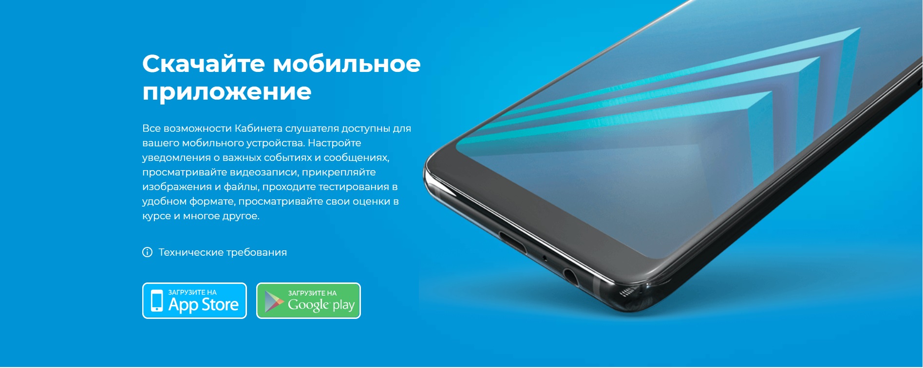 2. Мобильное приложение Moodle Mobile. Все возможности Кабинета слушателя доступны для вашего мобильного устройства. Скачав мобильное приложение Moodle Mobile на ваше устройство, вы сможете настраивать уведомления о важных событиях и сообщениях, просматривать видеозаписи, прикреплять изображения и файлы, проходить тестирования в удобном формате, просматривать свои оценки в курсе и многое другое.