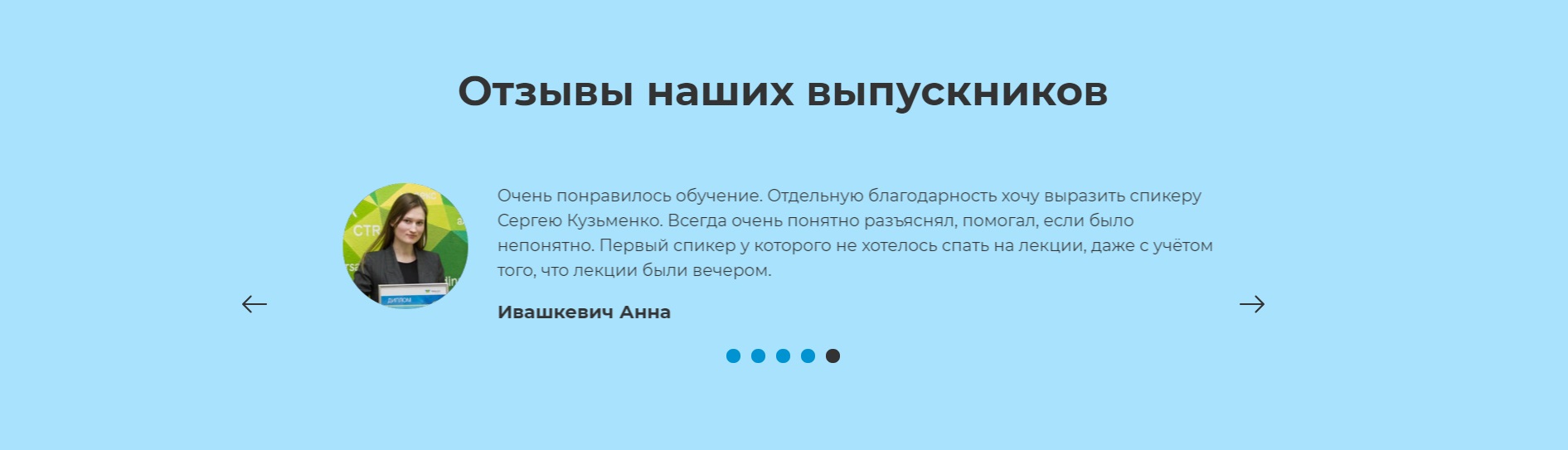 5. Отзывы выпускников курсов Webcom Academy. На главной странице сервиса вы сможете ознакомиться с отзывами, которые оставили слушатели очного и дистанционного обучения. Благодаря мнениям выпускников, вы сумеете сделать вывод о качестве обучения в образовательном центре и выбрать нужный вам курс.